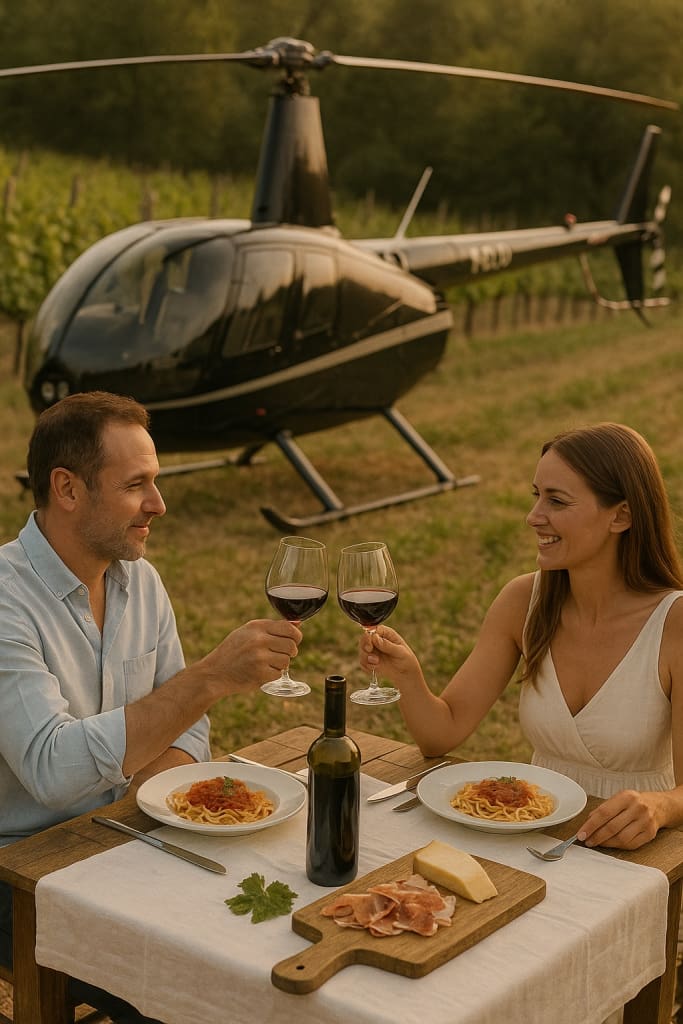 Un volo in elicottero porta in una tenuta nascosta tra i filari. La cena si svolge tra profumi, luci soffuse e calici scelti per esaltare ogni sapore ed emozione.