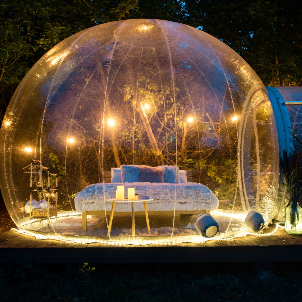 Una cupola trasparente immersa nel verde, dove il cielo diventa parte della stanza. Un’esperienza esclusiva tra natura, silenzio e meraviglia sotto le stelle.