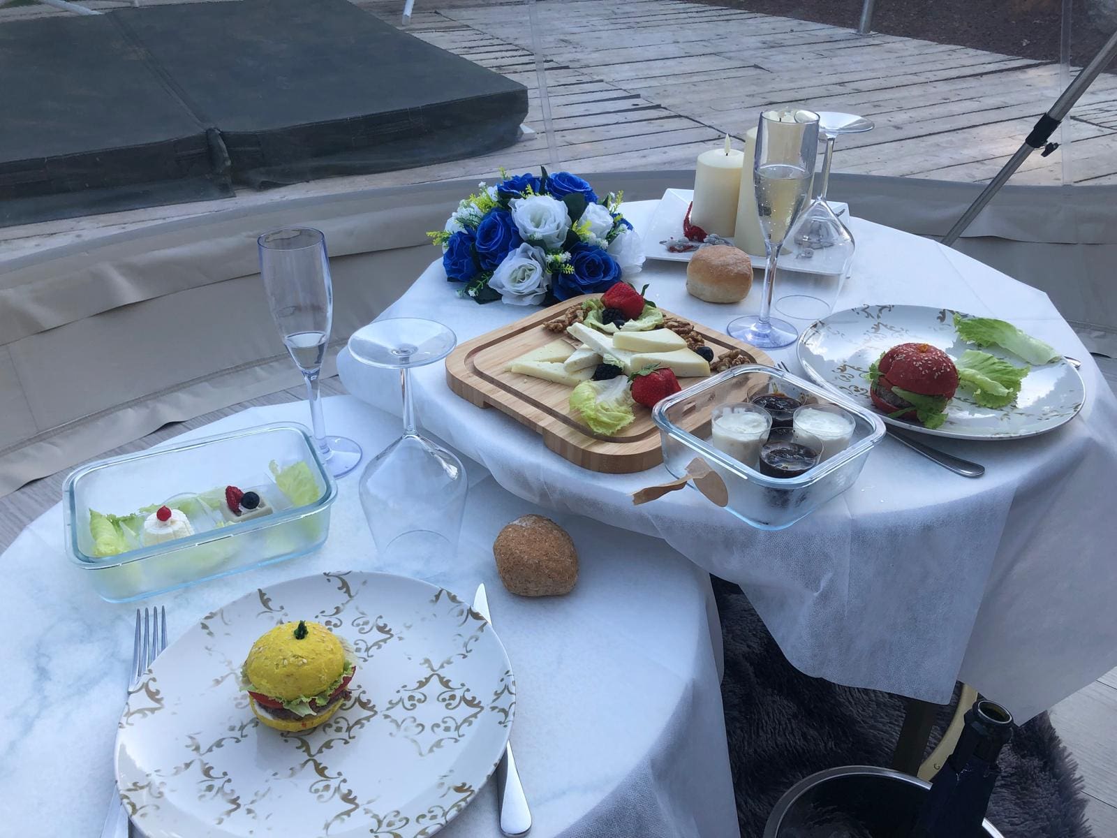A candlelit dinner, the glow of lights reflecting on the dome, and the feeling of living inside a dream — just the two of them, far from everything, closer than ever.